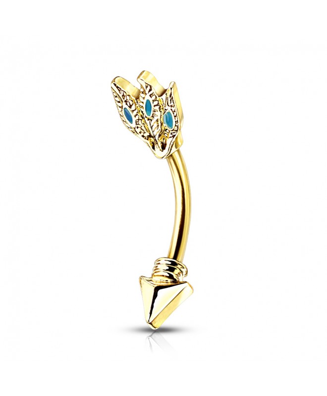 Piercing arcade sourcil plume aile fleche acier couleur doré ligne bleu 1.2 x8mm.