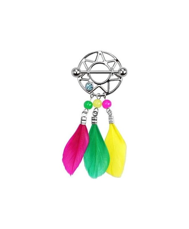 Piercing Teton Sein Poitrine Bouclier Etoile Attrape Reve Plume Rose Vert Jaune Strass Bleu