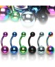 Percage ventre, bijoux piercing nombril plaqué titane avec reflets, tige en forme de banane, 1.6 x 10 mm, couleurs : violet, bleu roi, vert, noir, bleu clair, multicouleurs. Un bijou piercing mixte indémodable, au poli parfait, de très haute qualité.